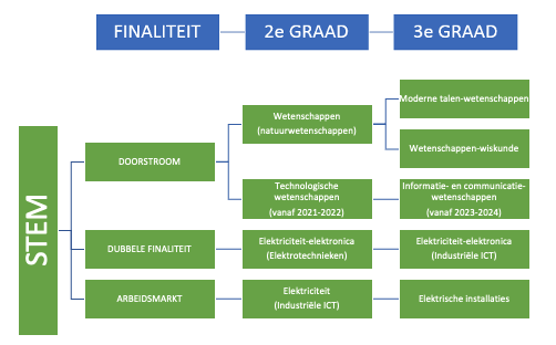 De leerlingen die kiezen voor een dubbele- of arbeidsmarktgerichte finaliteit zullen het domein STEM eerder ervaringsgericht- en toepassingsgericht ontdekken. Ze leren de verschillende fasen van een productieproces kennen om een technisch systeem, prototype of model te realiseren en te testen.