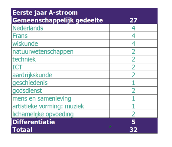 Leerlingen die op het einde van het basisonderwijs hun getuigschrift behaalden, komen in de A-stroom terecht. We bieden hen vier richtingen aan. Het gaat om de invulling van vier lesuren differentiatie in de week. De leerlingen kiezen op basis van hun kunnen en interesses. Ze ontdekken waar ze goed in zijn en wat ze willen doen. Zo slaan we 'met hen' de brug naar de tweede graad.